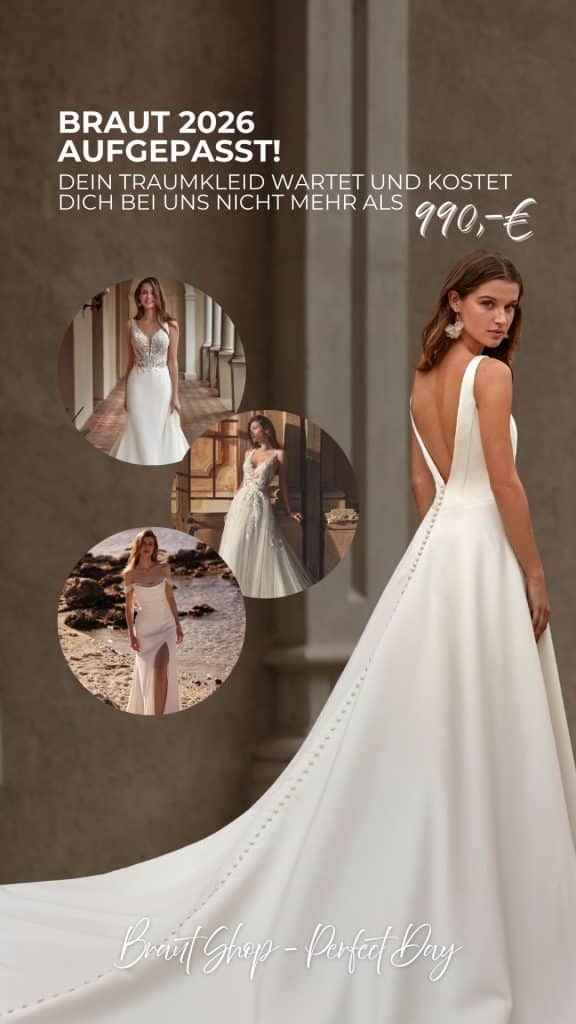 Dann bist Du bei Braut Shop-Perfect Day in Kürten genau richtig: Egal ob Brautmode in Bergisch Gladbach, Overath, Köln oder Brautmode in Gummersbach, bei uns findest Du fair kalkulierte Kleider von Größe 36 bis 46 für kleineres Budget, denn unser teuerstes Traumkleid kostet 990.- Euro.
